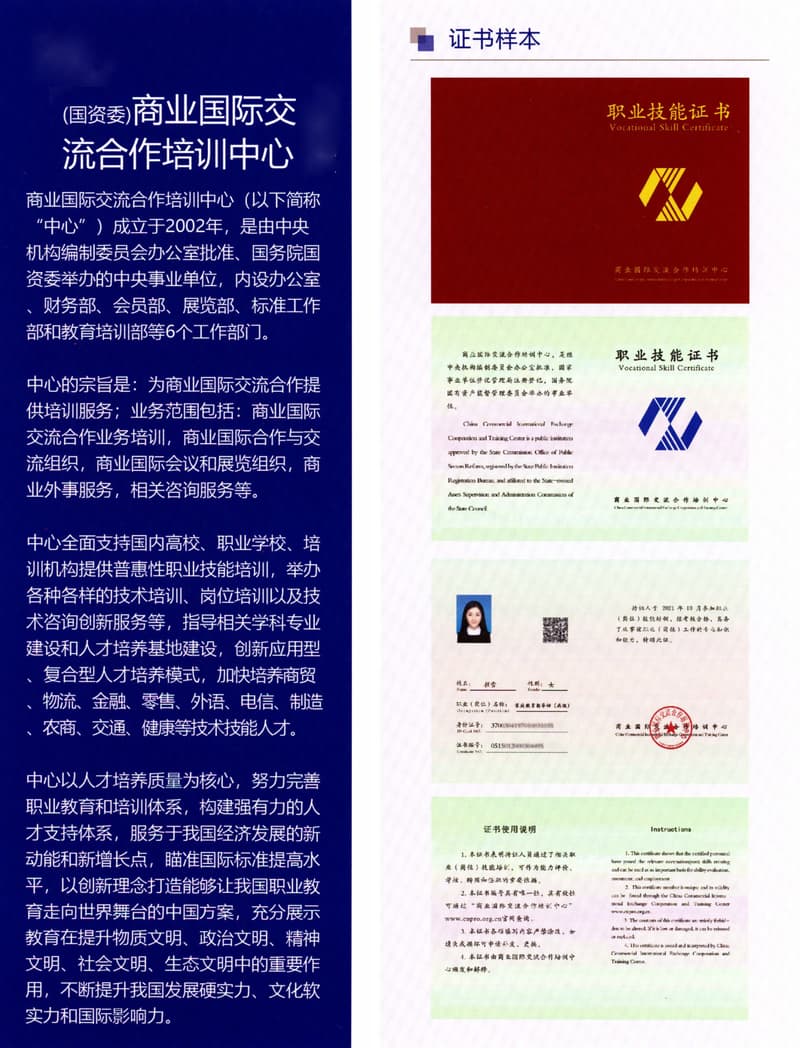 商业国际交流合作培训中心(以下简称“中心”)成立于2002年,是由中央机构编制委员会办公室批准、国务院国资委举办的中央事业单位,内设办公室财务部、会员部、展览部、标准工作部和教育培训部等6个工作部门。
