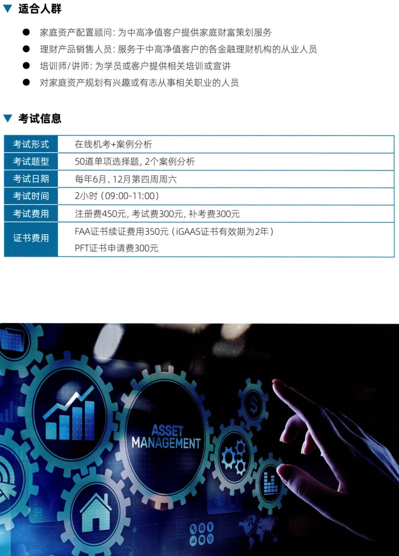 家庭资产配置架构师FAA(Family Asset Architect)是全球资产配置专家协会(iGAAS协会)发起设立的、面向从事家庭资产配置规划服务相关人士的专业水平鉴定。FAA认证围绕:家庭资产配置基础、核心资产配置策略、风险管理工具、卫星资产配置与沙盘演练等知识模块,对当今家庭资产配置规划从业人员提出了全面的专业知识和实操技能保持一致的严格评价标准。作为家庭资产配置规划领域的专业水平证书,...