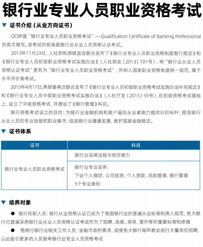 QCBP是“银行业专业人员职业资格考试”--Qualification Certificate of Banking Professional的英文缩写。该考试的前身是银行业从业人员资格认证考试。