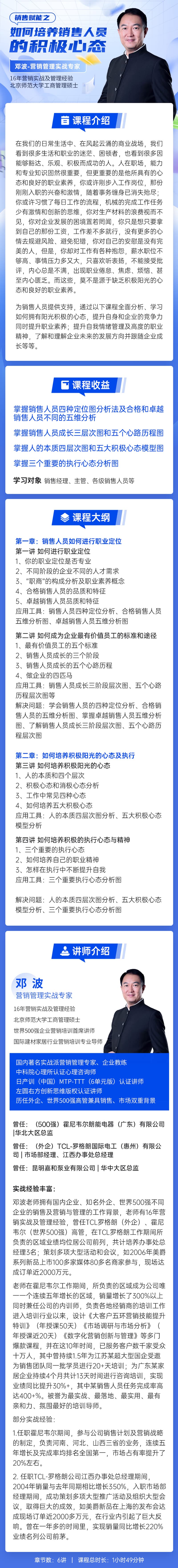 学习对象: 销售经理、主管、各级销售人员等 章节数: 6 课程形式:全屏入镜