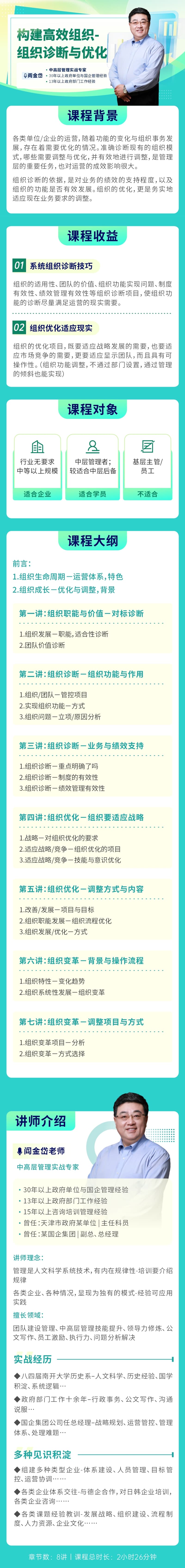 各类单位/企业的运营,随着功能的变化与组织事务发展,存在着需要优化的情况。准确诊断现有的组织模式,哪些需要调整与优化,并有效地进行调整,是管理层的重要任务,也对运营的成效影响很大。 组织诊断的依据,是...