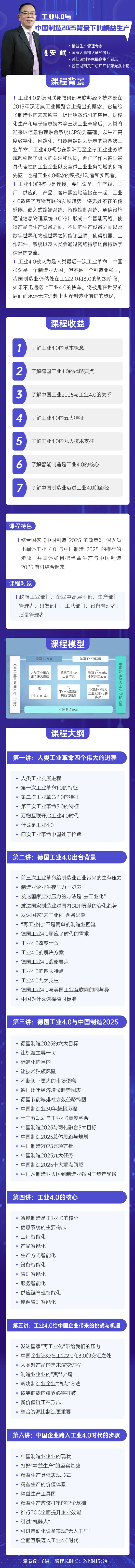 学习对象: 政府工业部门、企业中高层干部、生产部门管理者、研发部门、工艺部门、设备管理者、质量管理者 章节数: 7 课程形式:PPT录屏