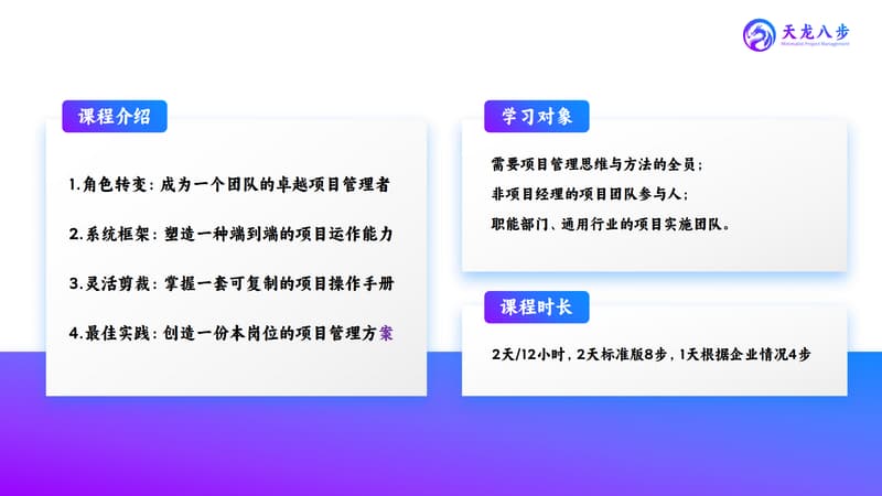 项目管理是企业快速发展的加速器,助力企业组织实现项目化转型,提升业务的核心竞争力。本课程将帮助学员切换思维“一键启动"项目管理,提升项目规划、执行与协作能力,掌握项目“思维-能力-操作”的方法,攀登行业项目管理的最佳实践。