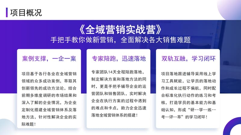 项目基于各行各业在全域营销领域的众多成功案例,萃取其创新领先的成功方法论,结合前期多维度调研的市场结果和深入了解的企业情况,为企业定制化搭建全域营销体系及落地方法,针对性解决企业的实际难题!