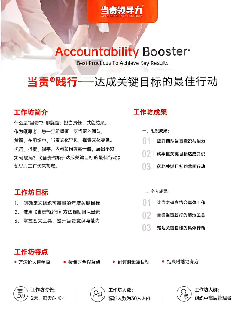 什么是"当责"?那就是:担当责任,共创结果。 作为领导者,您一定希望有一支当责的团队。 然而,在组织中,当责文化罕见,推责文化蔓延。 抱怨、指责、躺平、内卷如同病毒一般,层出不穷。 如何破局?《当责®践行-达成关键目标的最佳行动》领导力工作坊来帮您。