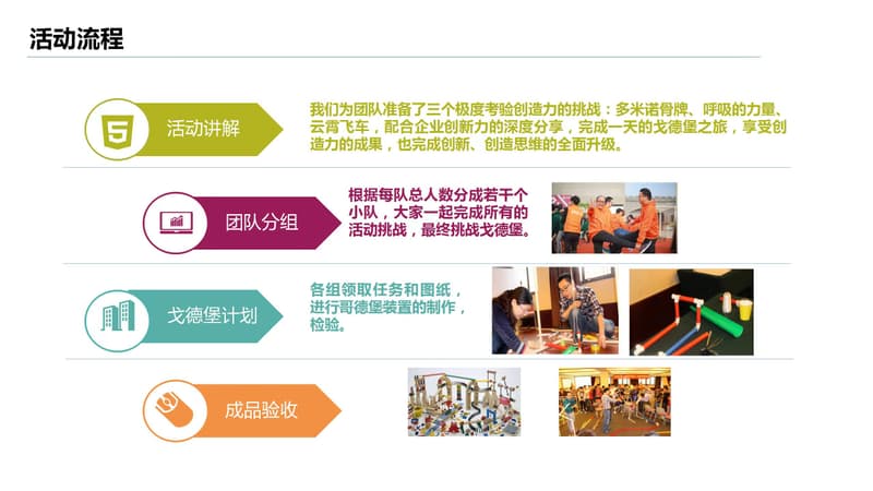 戈德堡装置是一种设计精密而复杂的机械,需要所有团队成员分工协作,用迂回曲折的方法,利用有限的材料(PVC管、电机、冷焰火、气球、电脑、音响、多米诺骨牌、滑轮等等)设计并制造出一套精确而复杂的巨型戈德堡装置,并能够利用这套装置自动运行来完成设想好的动作或任务。