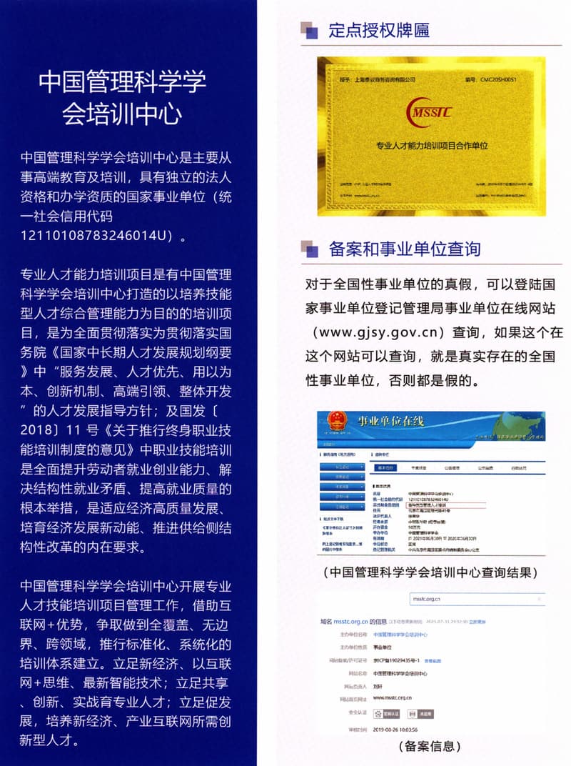 中国管理科学学会培训中心是主要从事高端教育及培训,具有独立的法人资格和办学资质的国家事业单位(统一社会信用代码12110108783246014U)专业人才能力培训项目是有中国管理科学学会培训中心打造的以培养技能型人才综合管理能力为目的的培训项目,是为全面贯彻落实为贯彻落实国务院《国家中长期人才发展规划纲要》中“服务发展、人才优先、用以为本、创新机制、高端引领、整体开发”的人才发展指导方针;及国发...