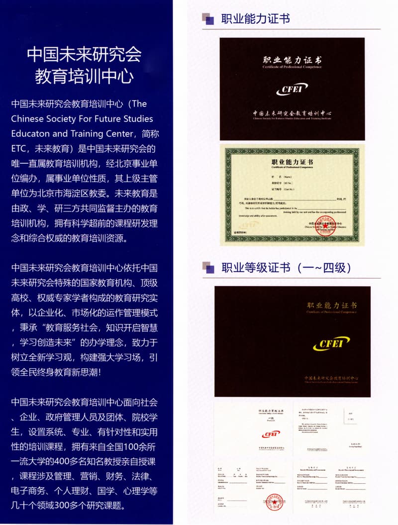 中国未来研究会教育培训中心(TheChinese Society For Future StudiesEducaton and Training Center,简称ETC,未来教育)是中国未来研究会的唯一直属教育培训机构,经北京事业单位编办,属事业单位性质,其上级主管单位为北京市海淀区教委。未来教育是由政、学、研三方共同监督主办的教育培训机构,拥有科学超前的课程研发理念和综合权威的教育培训资源。