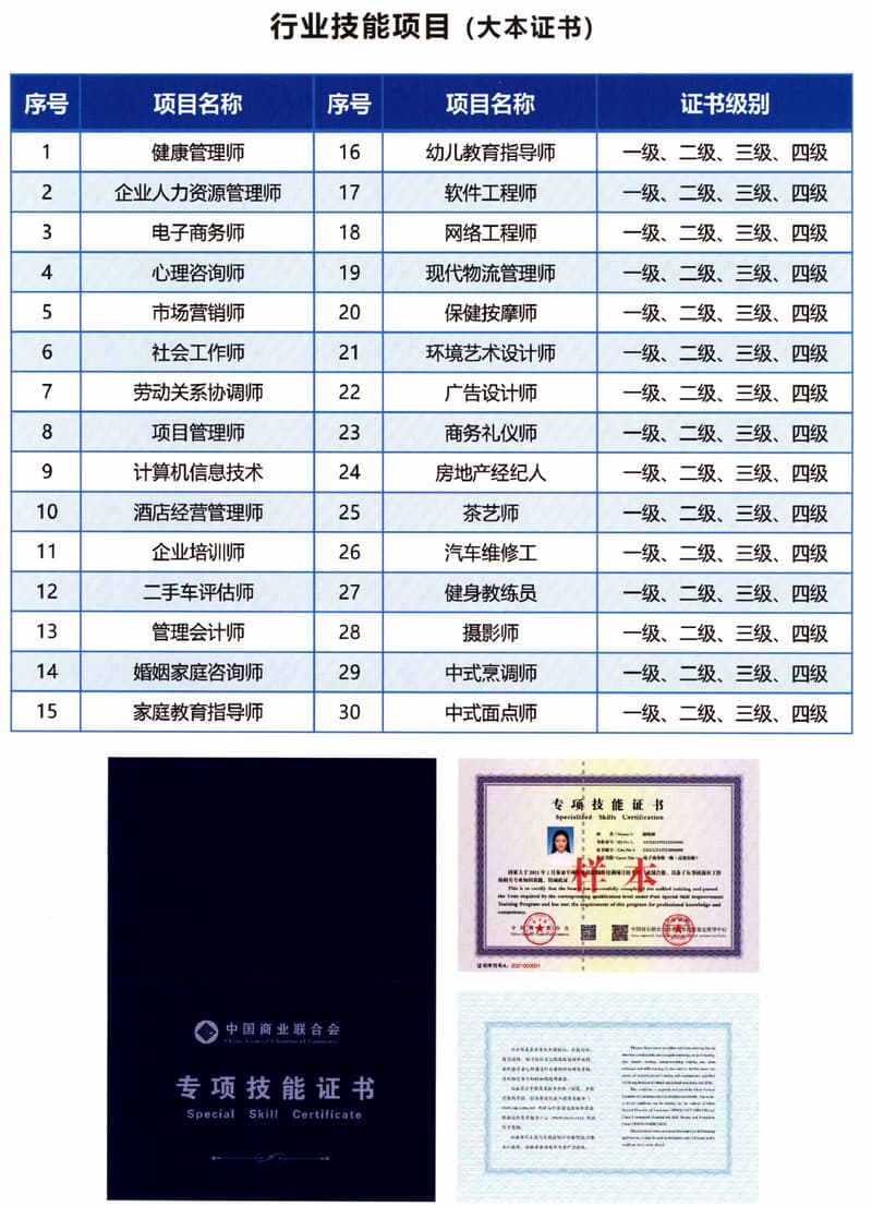 中国商业联合会商业职业技能鉴定指导中心(简称“中商职鉴”)负责开展商业行业职业技能鉴定,促进商业行业发展。商业行业特有工种职业技能鉴定及相关工作组织实施的事业法人单位;在国家相关机构和中国商业联合会授权下开展工作;是商业行业职业技能评价的专业机构。