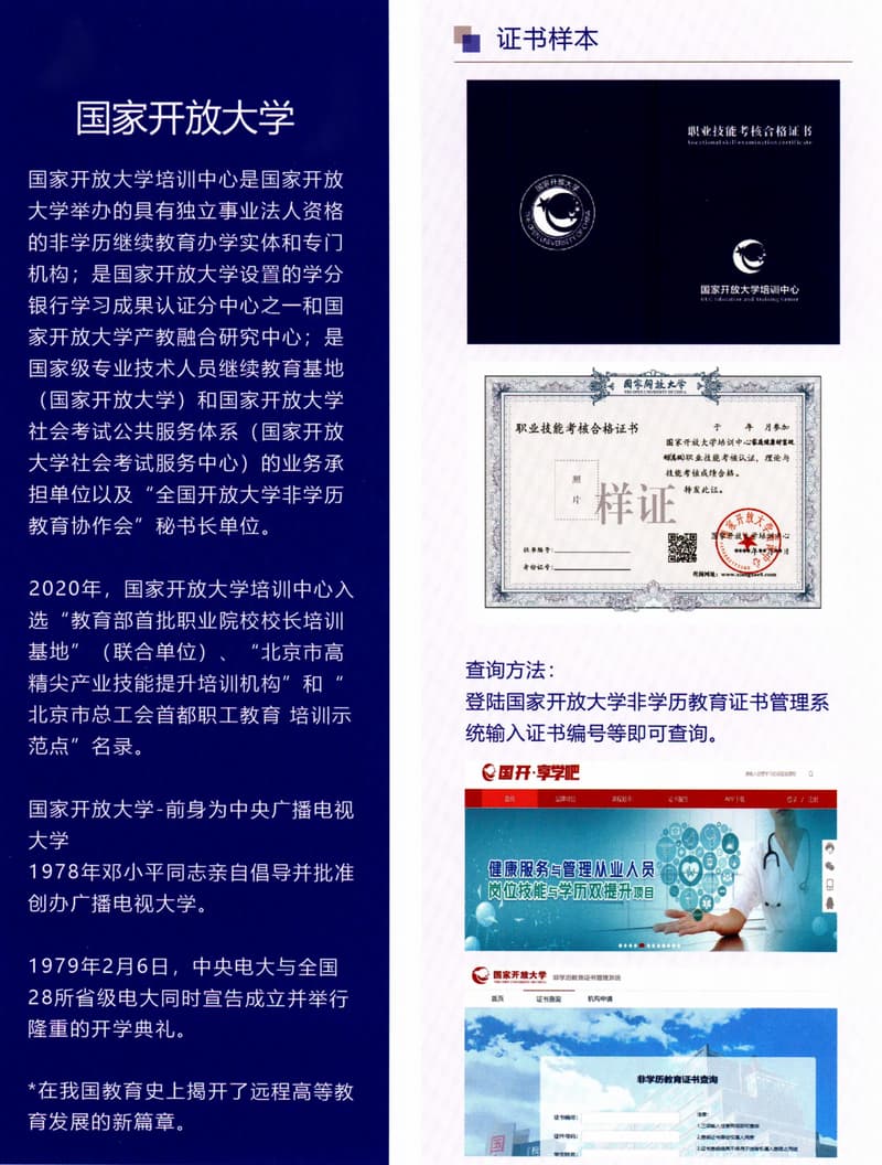 国家开放大学培训中心是国家开放大学举办的具有独立事业法人资格的非学历继续教育办学实体和专门机构;是国家开放大学设置的学分银行学习成果认证分中心之一和国家开放大学产教融合研究中心;是国家级专业技术人员继续教育基地(国家开放大学)和国家开放大学社会考试公共服务体系(国家开放大学社会考试服务中心)的业务承担单位以及“全国开放大学非学历教育协作会”秘书长单位。