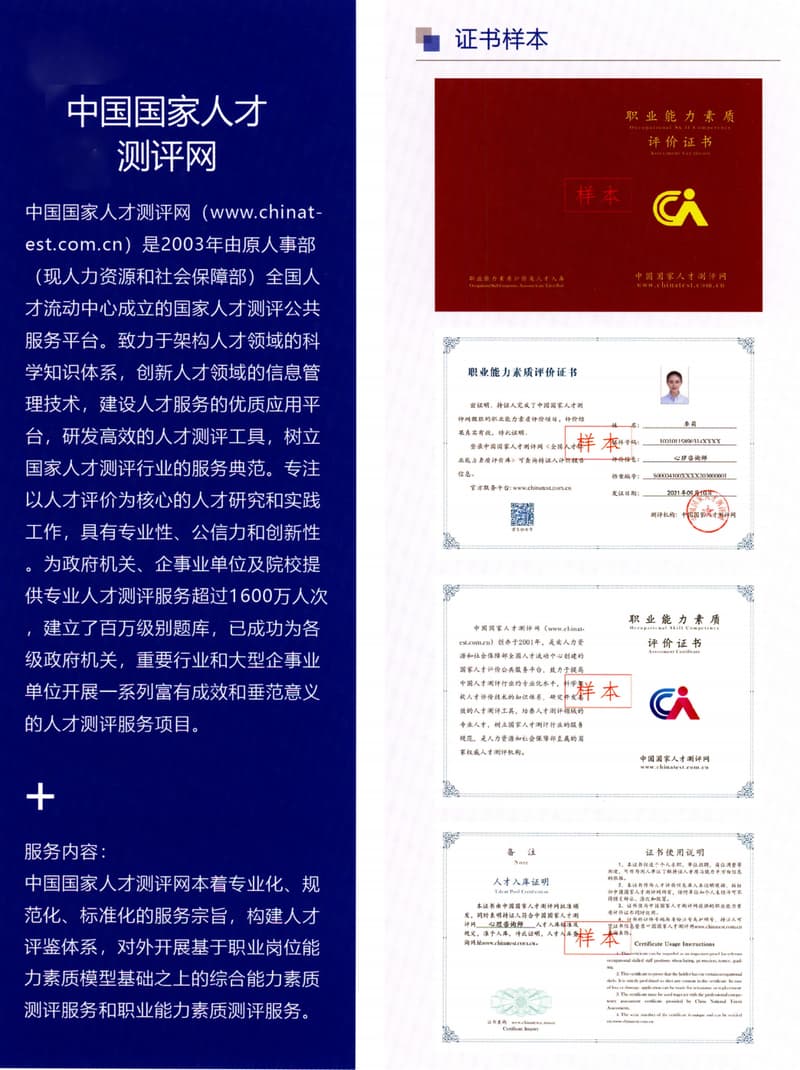 中国国家人才测评网(www.chinat-est.com.cn)是2003年由原人事部(现人力资源和社会保障部)全国人才流动中心成立的国家人才测评公共服务平台。致力于架构人才领域的科学知识体系,创新人才领域的信息管理技术,建设人才服务的优质应用平台,研发高效的人才测评工具,树立国家人才测评行业的服务典范。专注以人才评价为核心的人才研究和实践工作,具有专业性、公信力和创新性为政府机关、企事业单位及院...