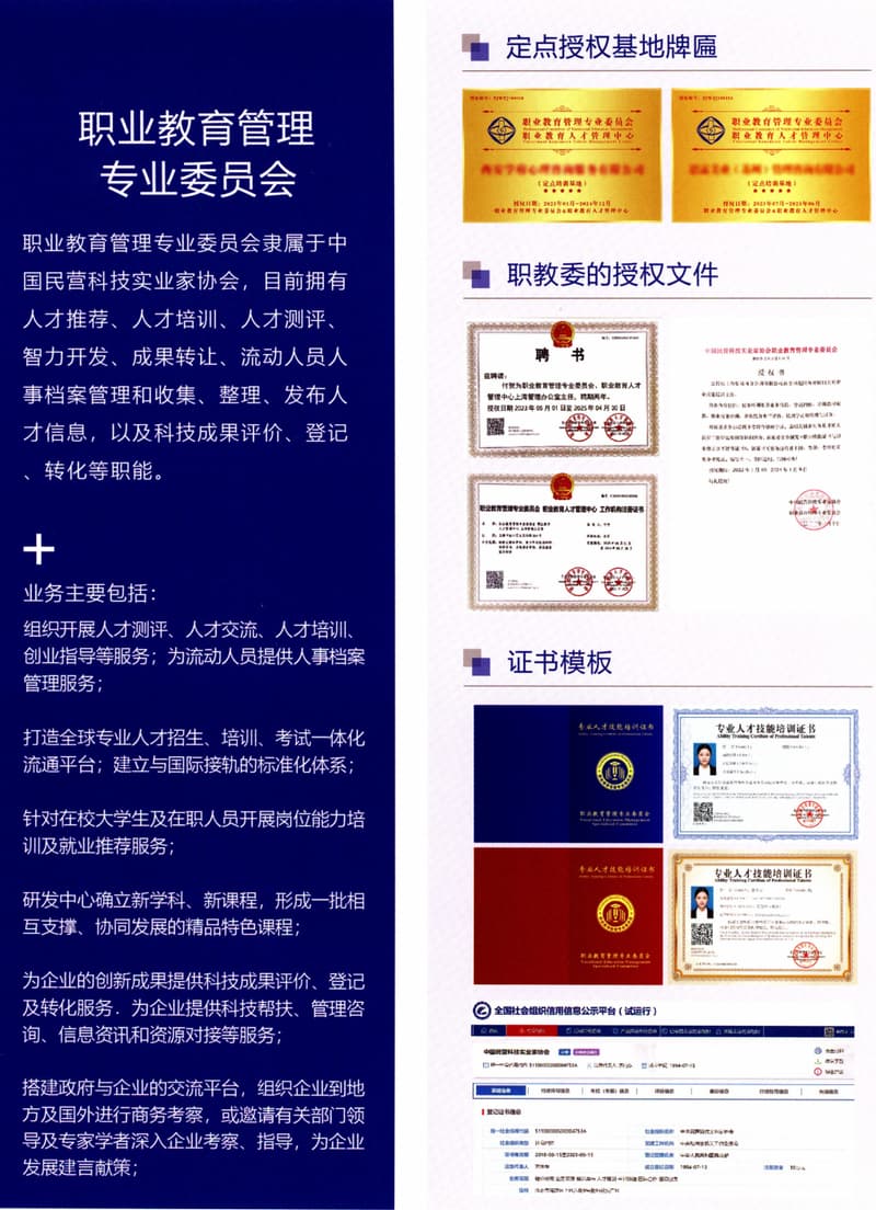 职业教育管理专业委员会隶属于中国民营科技实业家协会,目前拥有人才推荐、人才培训、人才测评智力开发、成果转让、流动人员人事档案管理和收集、整理、发布人才信息,以及科技成果评价、登记转化等职能。