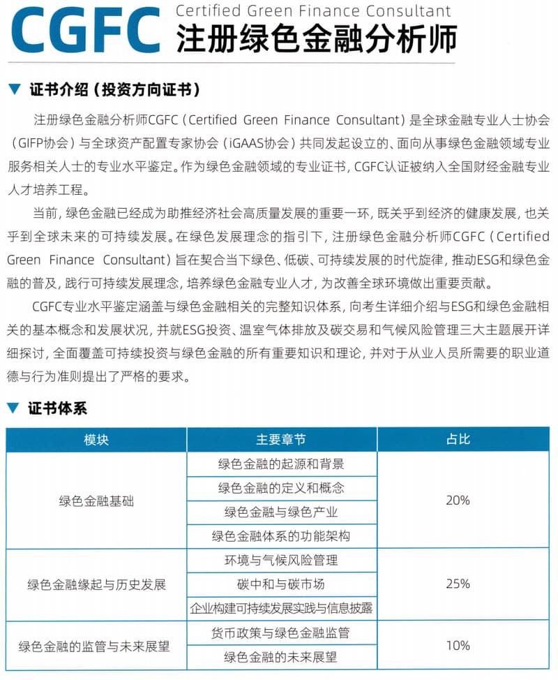 注册绿色金融分析师CGFC(Certified Green Finance Consultant)是全球金融专业人士协会(GIFP协会)与全球资产配置专家协会(iGAAS协会)共同发起设立的、面向从事绿色金融领域专业服务相关人士的专业水平鉴定。作为绿色金融领域的专业证书,CGFC认证被纳入全国财经金融专业人才培养工程。