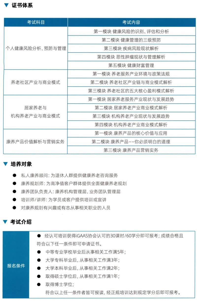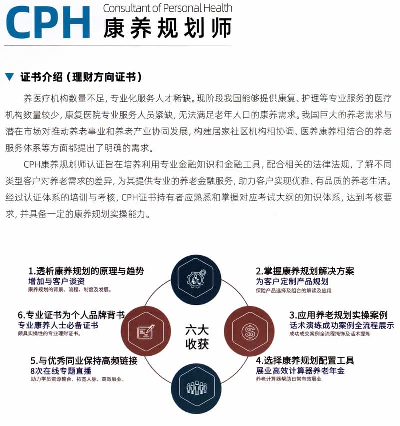养医疗机构数量不足,专业化服务人才稀缺。现阶段我国能够提供康复、护理等专业服务的医疗机构数量较少,康复医院专业服务人员紧缺,无法满足老年人口的康养需求。我国巨大的养老需求与潜在市场对推动养老事业和养老产业协同发展,构建居家社区机构相协调、医养康养相结合的养老服务体系等方面都提出了明确的需求。 CPH康养规划师认证旨在培养利用专业金融知识和金融工具,配合相关的法律法规,了解不同类型客户对养老需求的差...