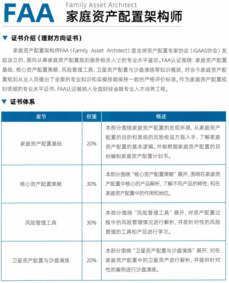 家庭资产配置架构师FAA(Family Asset Architect)是全球资产配置专家协会(iGAAS协会)发起设立的、面向从事家庭资产配置规划服务相关人士的专业水平鉴定。FAA认证围绕:家庭资产配置基础、核心资产配置策略、风险管理工具、卫星资产配置与沙盘演练等知识模块,对当今家庭资产配置规划从业人员提出了全面的专业知识和实操技能保持一致的严格评价标准。作为家庭资产配置规划领域的专业水平证书,...