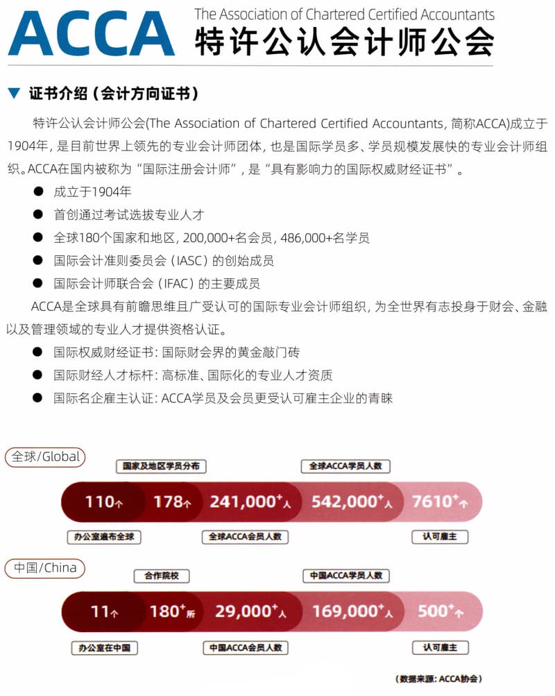 特许公认会计师公会(The Association of Chartered Certified Accountants,简称ACCA)成立于1904年,是目前世界上领先的专业会计师团体,也是国际学员多、学员规模发展快的专业会计师组织。ACCA在国内被称为“国际注册会计师”,是“具有影响力的国际权威财经证书”