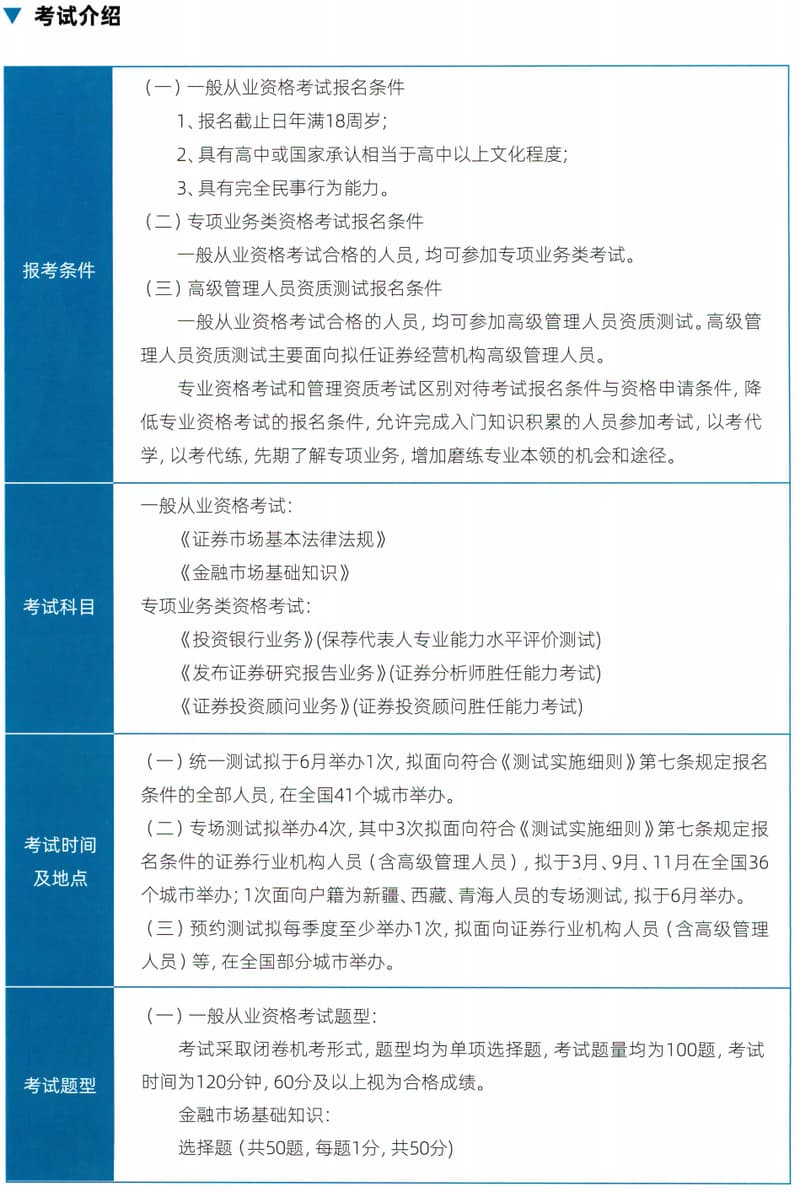 证券从业考试分为一般从业资格考试、专项业务类资格考试和管理类资格考试,通过一般从业资格考试后就可以报考专项类和管理资质考试。专项业务类资格考试是专业资格考试,主要测试考生是否具备从事证券业务所必备的专业知识、专业技能和专业操守。管理类资格考试是管理资质测试,主要测试考生是否掌握在证券经营机构履行经营管理所必备的管理流程和管理标准。