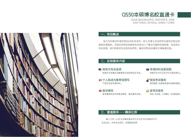 我们为有意向申请世界QS50名校本科、硕士及博士项目的学生提供定制化的精准申请服务。凭借对世界名校教育体系的深入了解及丰富的申请经验,结合塔尖名校资源,我们帮助学生实现名校梦想,确保世界OS50留学之路畅通无阻。