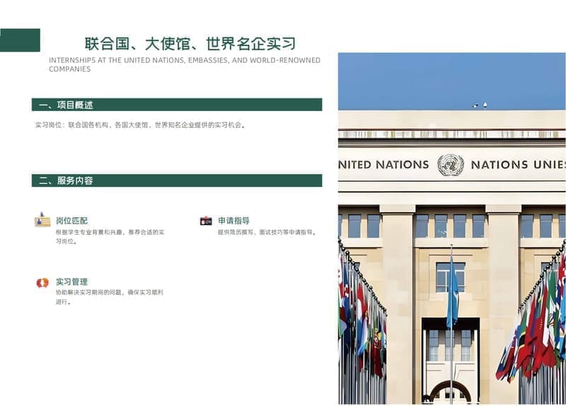 实习岗位:联合国各机构、各国大使馆、世界知名企业提供的实习机会。