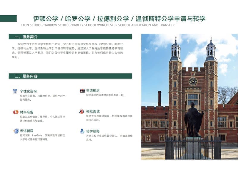 我们致力于为全球学生提供一站式、全方位的英国顶尖私立学校(伊顿公学、哈罗公学、拉德利公学、温彻斯特公学)申请与转学服务。通过深入了解每所学校的独特教育理念、课程设置及入学要求,我们为每位学生量身定制申请策略,助力他们成功踏入心仪的学府。