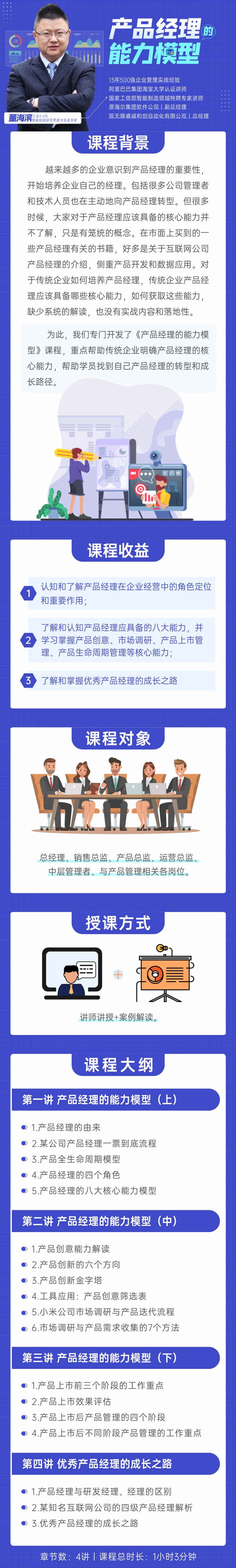 学习对象: 总经理、销售总监、产品总监、运营总监、中层管理者、与产品管理相关各岗位 章节数: 4 课程形式:PPT录屏