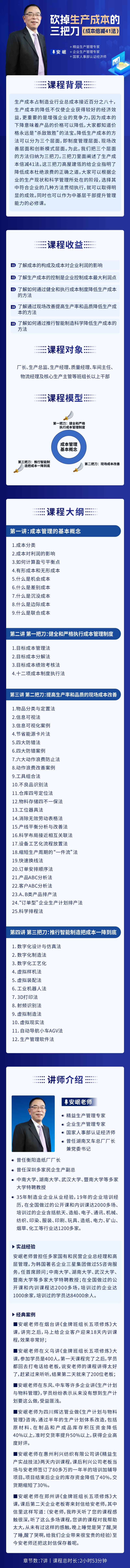 学习对象: 厂长、生产总监、生产经理、质量经理、车间主任、物流经理及核心生产主管等班组长以上干部 章节数: 7 课程形式:小框出镜
