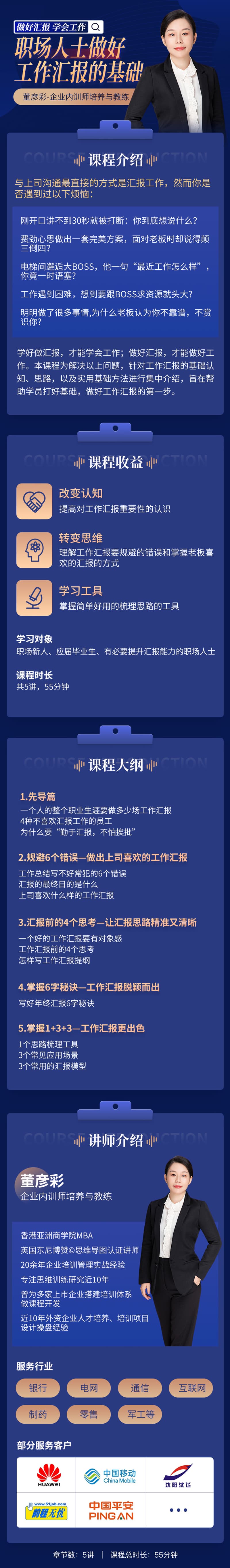 学习对象: 职场新人、应届毕业生、有必要提升汇报能力的职场人士 章节数: 5 课程形式:全屏入镜