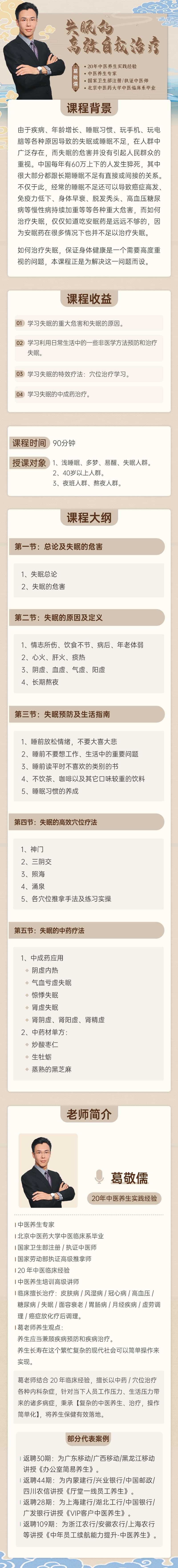 学习对象: 1、浅睡眠、多梦、易醒、失眠人群。 2、40岁以上人群。 3、夜班人群、熬夜人群。 章节数: 5 课程形式:全屏入镜