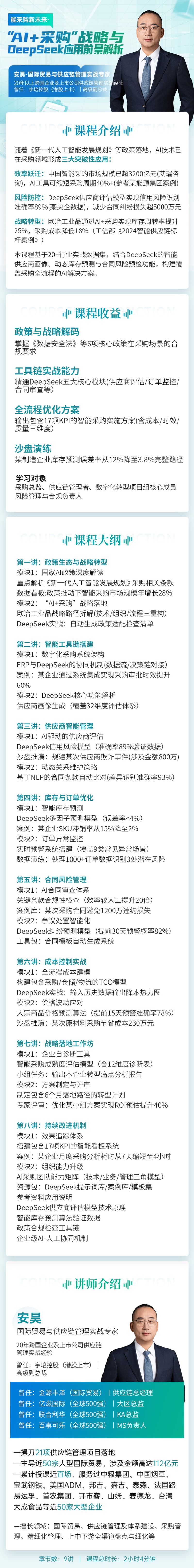 学习对象: 采购总监、供应链管理者 数字化转型项目组核心成员 风险管理与合规负责人 章节数: 9 课程形式:全屏入镜