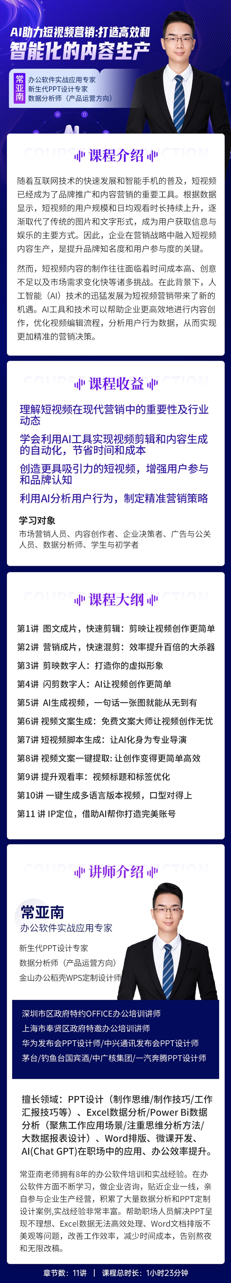 学习对象: 市场营销人员、内容创作者、企业决策者、广告与公关人员、数据分析师、学生与初学者 章节数: 11 课程形式:小框出镜