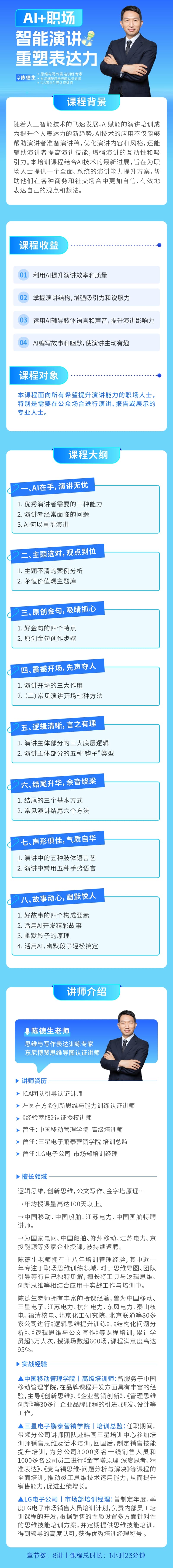 学习对象: 本课程面向所有希望提升演讲能力的职场人士,特别是需要在公众场合进行演讲、报告或展示的专业人士。 章节数: 8 课程形式:全屏入镜