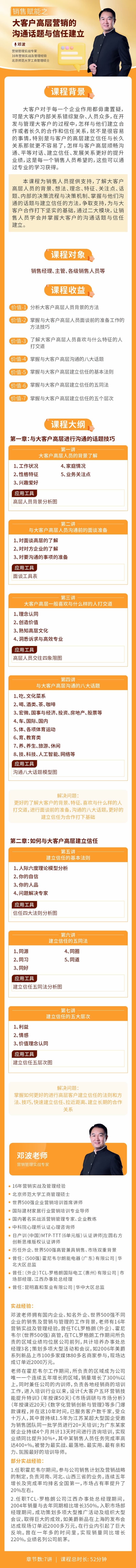 学习对象: 销售经理、主管、各级销售人员等 章节数: 7 课程形式:全屏入镜