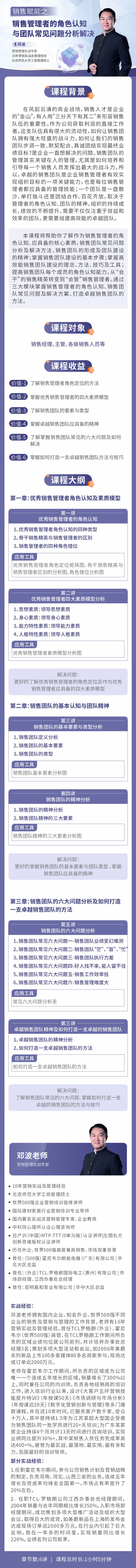 学习对象: 销售经理、主管、各级销售人员等 章节数: 6 课程形式:全屏入镜