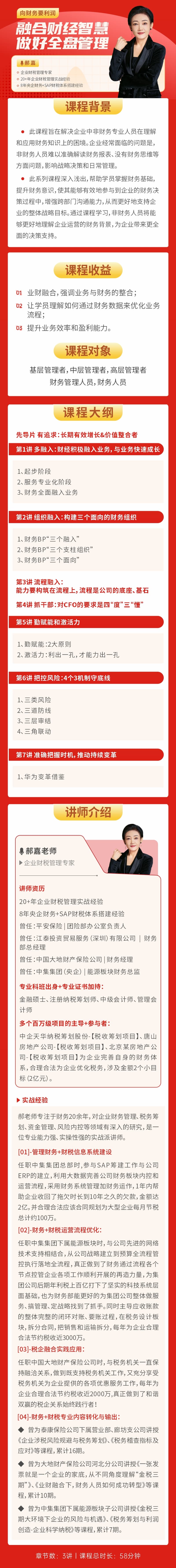 学习对象: 基层管理者,中层管理者,高层管理者,财务管理人员,财务人员 章节数: 8 课程形式:全屏入镜