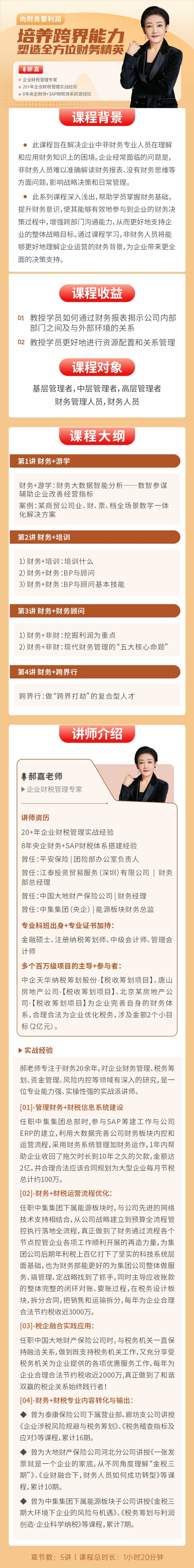 学习对象: 基层管理者,中层管理者,高层管理者,财务管理人员,财务人员 章节数: 5 课程形式:全屏入镜