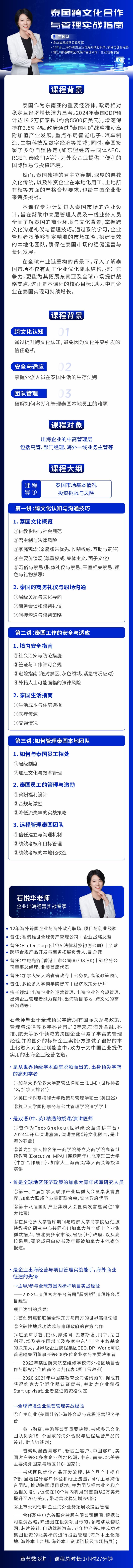 学习对象: 出海企业的中高管理层,包括高管、部门经理、海外一线业务主管等 章节数: 8 课程形式:全屏入镜