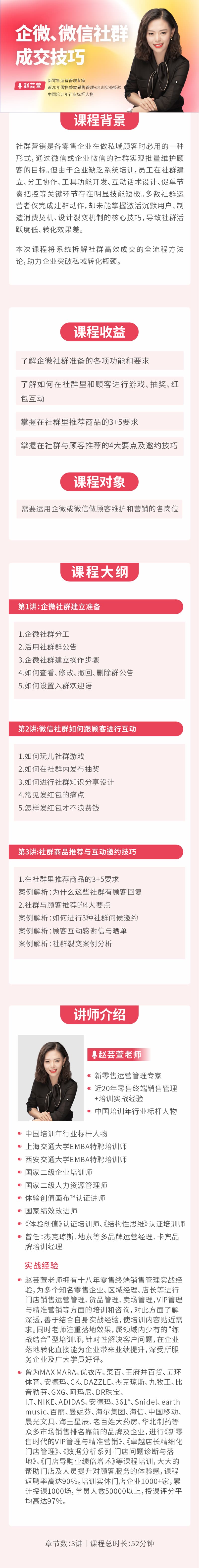 学习对象: 需要运用企微或微信做顾客维护和营销的各岗位 章节数: 6 课程形式:全屏入镜