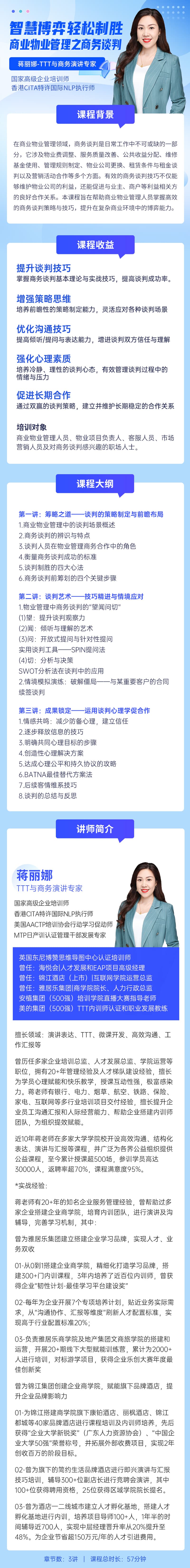 学习对象: 商业物业管理人员、物业项目负责人、客服人员、市场营销人员及对商务谈判感兴趣的职场人士。 章节数: 3 课程形式:全屏入镜