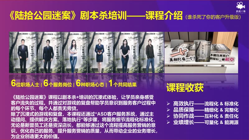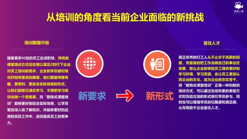 随着更多00后的员工走进职场,传统的课堂培训方式往往难以满足Z时代下企业对员工培训的需求,企业和学员都对培训开始有更高的期望,他们期望用更有趣、更有料、更结合实际场景的形式,让他们能够沉浸式学习,不再把学习培训当做一个苦差事。而“剧场式课堂培训”能够更好地结合实际场景,让学员更加深入地了解知识,并能够更好的应用到实际工作中,进而提高员工的竞争力。