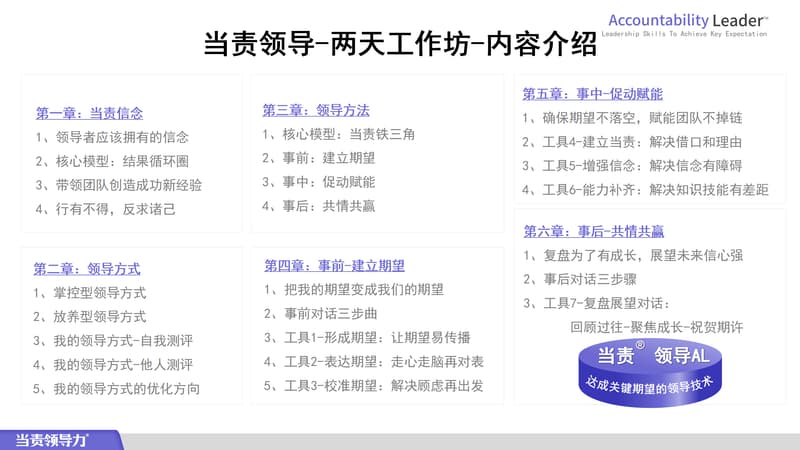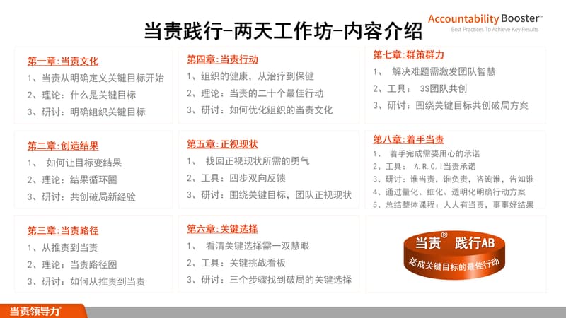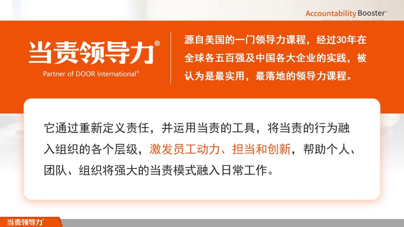 它通过重新定义责任,并运用当责的工具,将当责的行为融入组织的各个层级,激发员工动力、担当和创新,帮助个人团队、组织将强大的当责模式融入日常工作。