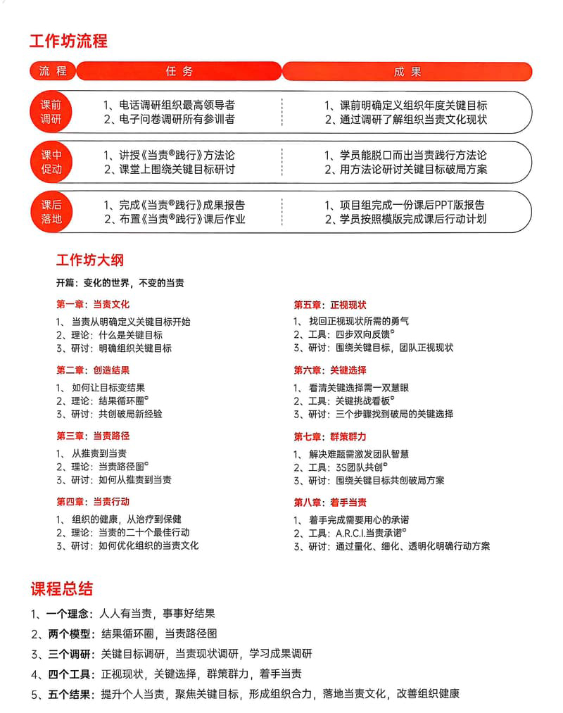 什么是"当责"?那就是:担当责任,共创结果。 作为领导者,您一定希望有一支当责的团队。 然而,在组织中,当责文化罕见,推责文化蔓延。 抱怨、指责、躺平、内卷如同病毒一般,层出不穷。 如何破局?《当责®践行-达成关键目标的最佳行动》领导力工作坊来帮您。