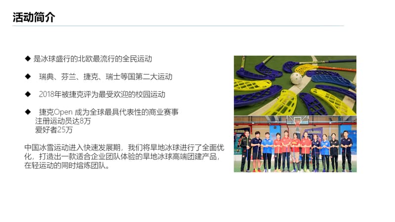 中国冰雪运动进入快速发展期,我们将旱地冰球进行了全面优化,打造出一款适合企业团队体验的旱地冰球高端团建产品在轻运动的同时熔炼团队。