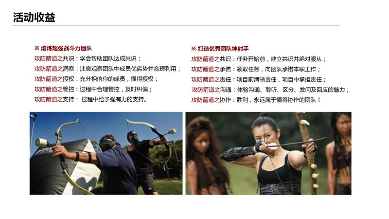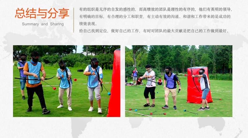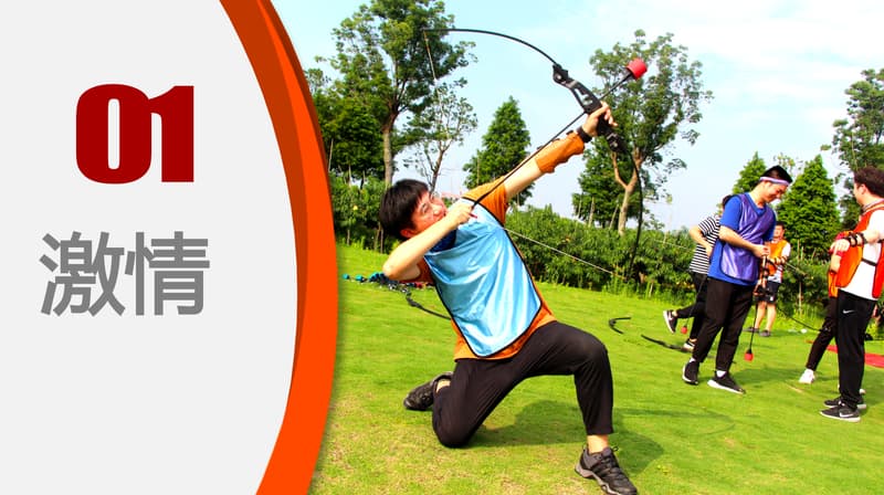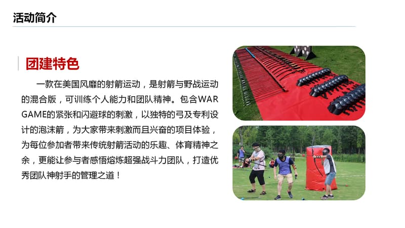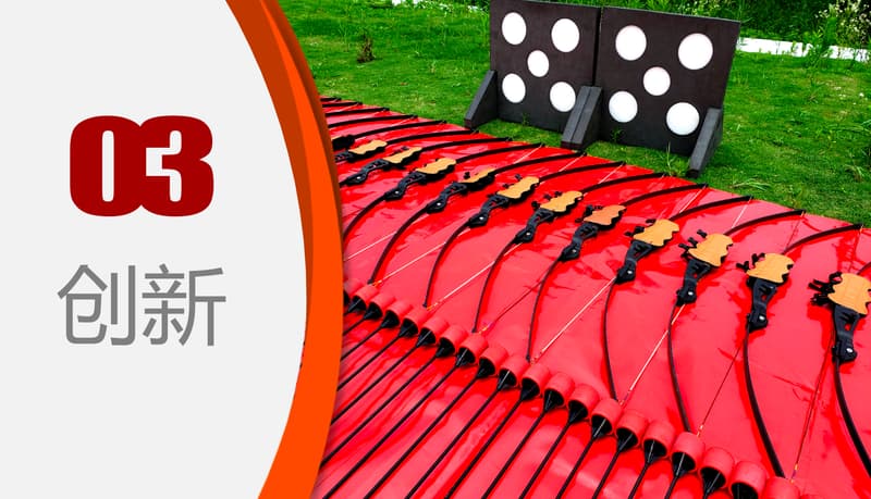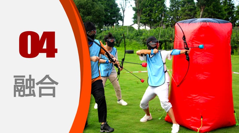 一款在美国风靡的射箭运动,是射箭与野战运动的混合版,可训练个人能力和团队精神。包含WARGAME的紧张和闪避球的刺激,以独特的弓及专利设计的泡沫箭,为大家带来刺激而且兴奋的项目体验为每位参加者带来传统射箭活动的乐趣、体育精神之余,更能让参与者感悟熔炼超强战斗力团队,打造优秀团队神射手的管理之道!