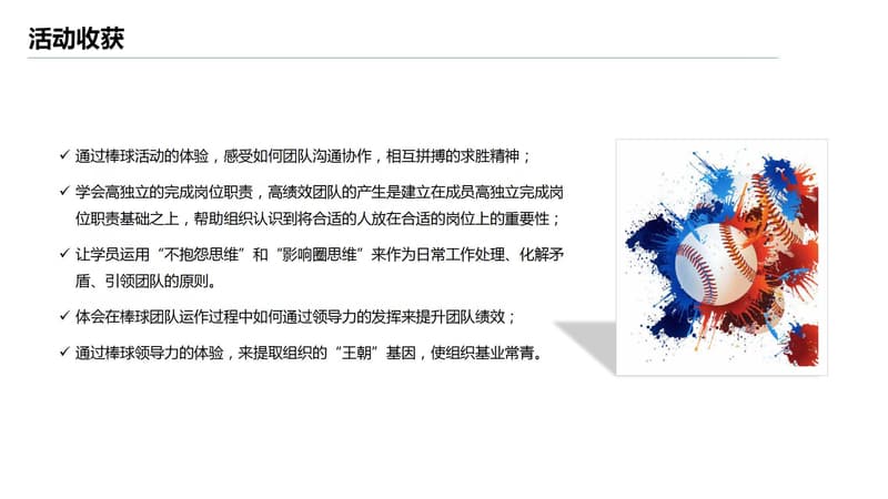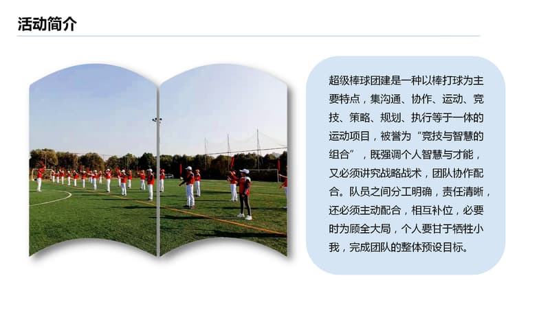 超级棒球团建是一种以棒打球为主要特点,集沟通、协作、运动、竟技、策略、规划、执行等于一体的运动项目,被誉为“竟技与智慧的组合”既强调个人智慧与才能又必须讲究战略战术,团队协作配合。队员之间分工明确,责任清晰还必须主动配合,相互补位,必要时为顾全大局,个人要甘于牺牲小我,完成团队的整体预设目标。