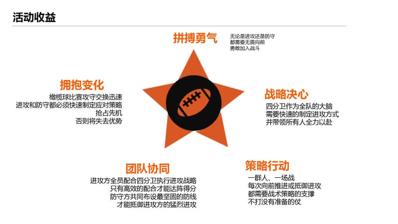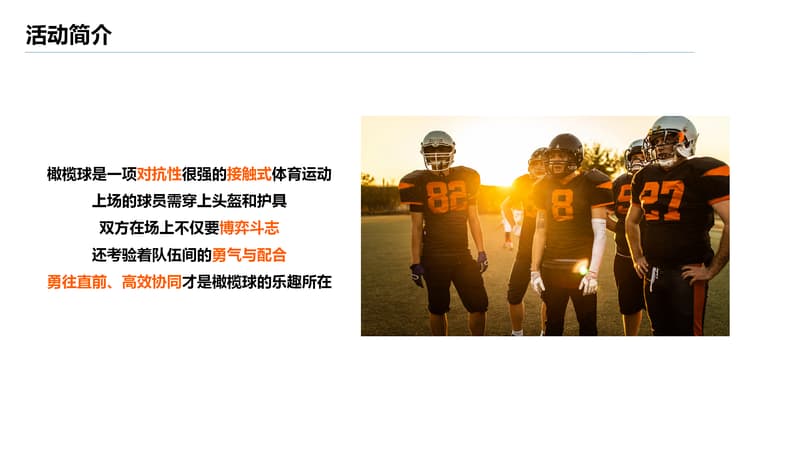 橄榄球是一项对抗性很强的接触式体育运动上场的球员需穿上头盔和护具,双方在场上不仅要博弈斗志,还考验着队伍间的勇气与配合,勇往直前、高效协同才是橄榄球的乐趣所在。