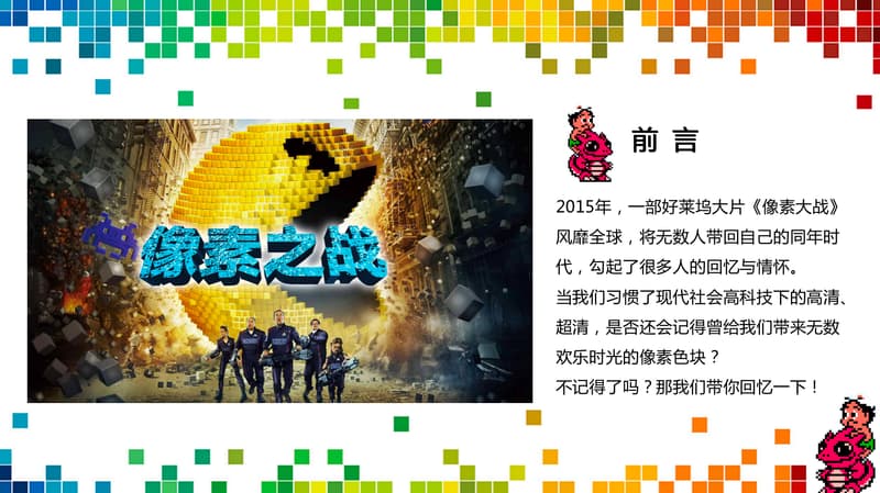 一部好莱坞大片《像素大战》风靡全球,将无数人带回自己的同年时代,勾起了很多人的回忆与情怀。当我们习惯了现代社会高科技下的高清、超清,是否还会记得曾给我们带来无数欢乐时光的像素色块 ?不记得了吗?那我们带你回忆一下!