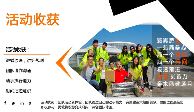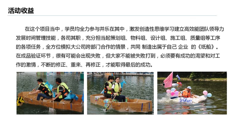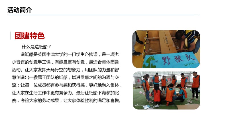 造纸船是英国牛津大学的一门学生必修课,是一项老少皆宜的创意手工课,有趣且富有创意,最适合集体团建活动。让大家发挥天马行空的想象力,用团队的力量和智慧创造出一艘属于团队的纸船,增进同事之间的沟通与交流;让每一位成员都有参与感和获得感,更好地融入集体让大家在生活工作中更有竞争力。最后让纸船下海参加比赛,考验大家的劳动成果,让大家体验胜利的满足和喜悦。