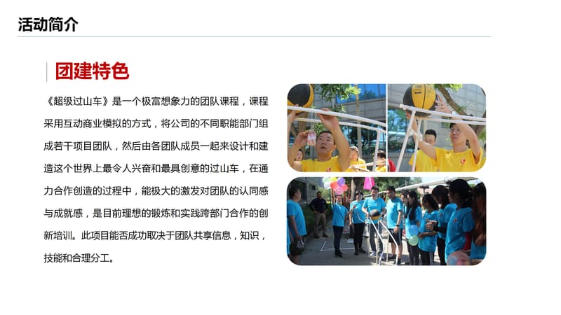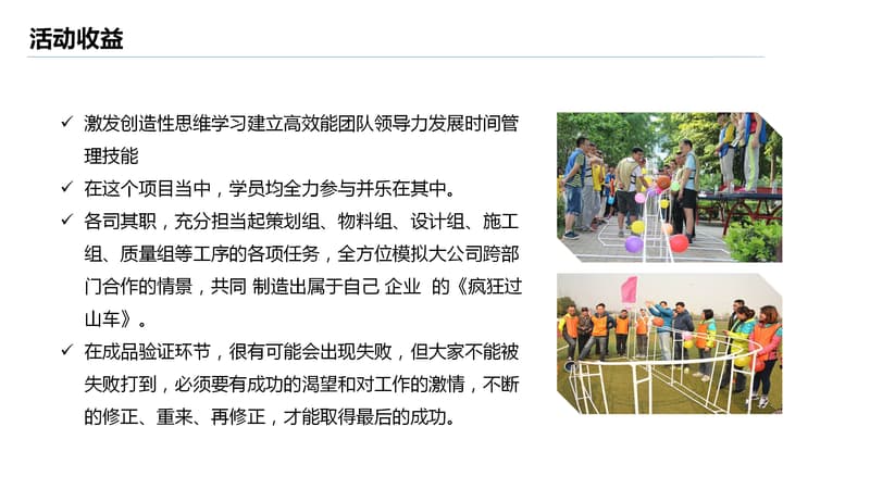 《超级过山车》是一个极富想象力的团队课程,课程采用互动商业模拟的方式,将公司的不同职能部门组成若干项目团队,然后由各团队成员一起来设计和建造这个世界上最令人兴奋和最具创意的过山车,在通力合作创造的过程中,能极大的激发对团队的认同感与成就感,是目前理想的锻炼和实践跨部门合作的创新培训。此项目能否成功取决于团队共享信息,知识技能和合理分工。