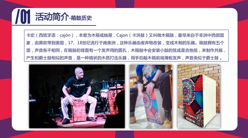 卡宏(西班牙语:cajón),本意为木箱或抽屉,Cajon(卡洪鼓)又叫做木箱鼓,最早来自于非洲中西部国家,由黑奴带到美国,17、18世纪流行于南美洲,这种乐器由废弃物改装,变成木制的乐器。箱鼓拥有五个面,声音各不相同,在箱鼓的背面有一个发声用的圆孔,木箱鼓中会安装小鼓的弦或是吉他弦,来制作共振产生和爵士鼓相似的声音,是一种箱状的木质打击乐器,用手拍敲木箱前端薄板发声,声音类似于爵士鼓。