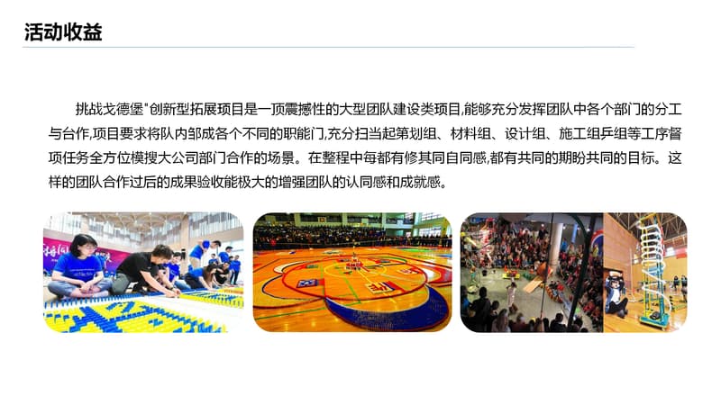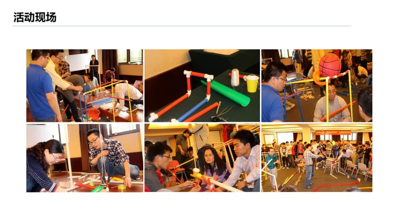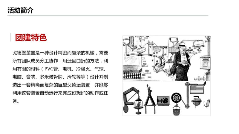 戈德堡装置是一种设计精密而复杂的机械,需要所有团队成员分工协作,用迂回曲折的方法,利用有限的材料(PVC管、电机、冷焰火、气球、电脑、音响、多米诺骨牌、滑轮等等)设计并制造出一套精确而复杂的巨型戈德堡装置,并能够利用这套装置自动运行来完成设想好的动作或任务。